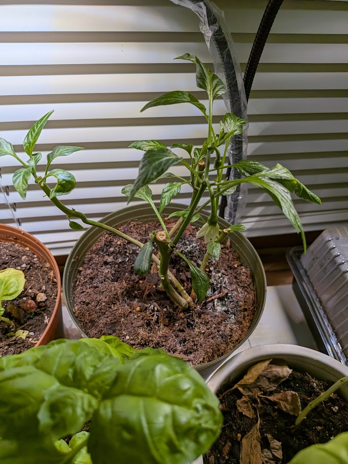 The jalapeno plants eventually strengthened and grew flowers, and soon we had a handful of peppers of equal quality that you’d find in a grocery store. Autumn came, and we decided to winterize the plants and bring them indoors. We simply trimmed off all of the leaves, and left the four twisted stems in the same pot they sprouted in. An online video had extra steps, including washing the roots and re-planting into fresh dirt, but we did none of that. This was back in late October, but here now in January, under the energy of a grow lamp, the plants have new leaves, buds, and flowers.